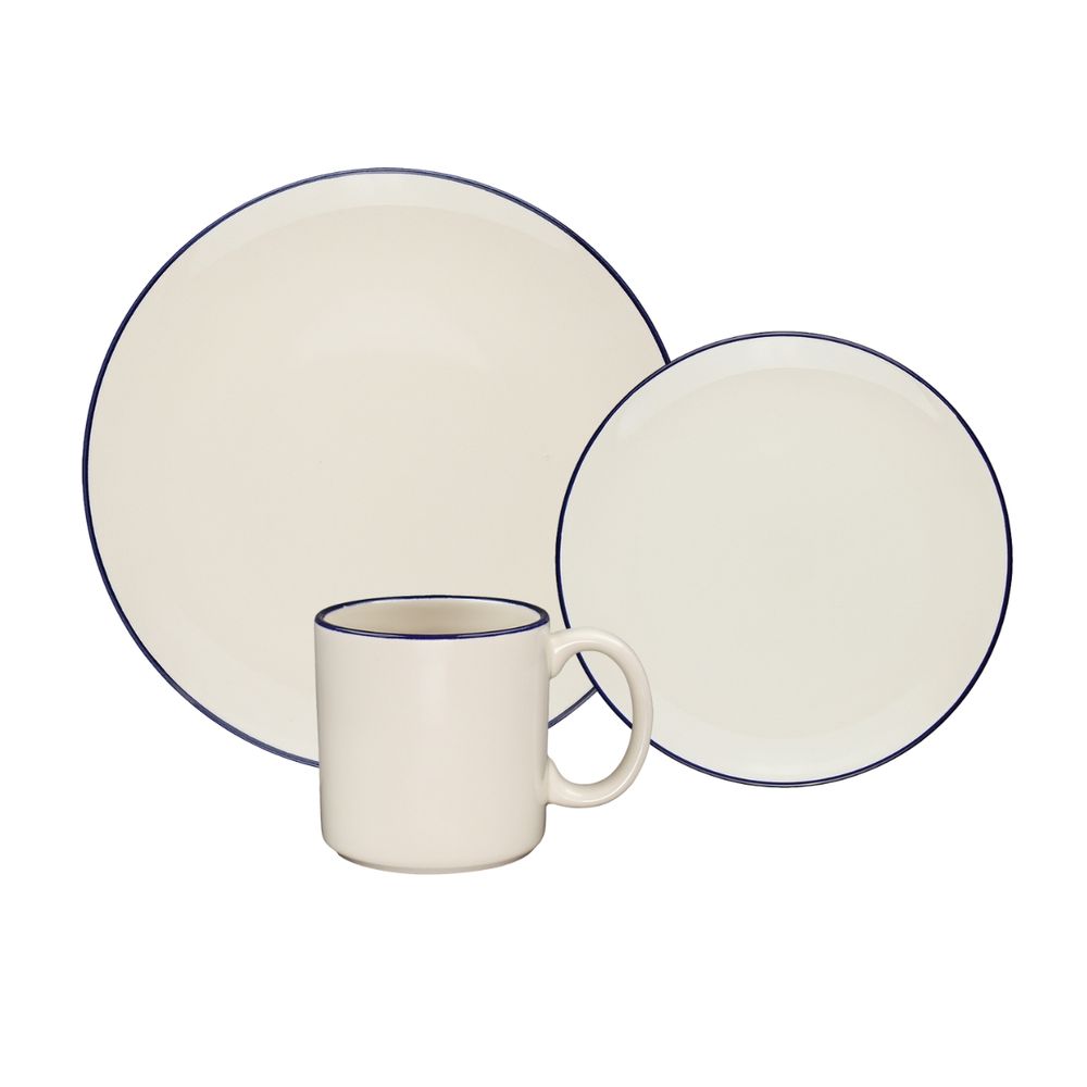 A base off-white com filete azul cria contraste sutil e atemporal, valorizando a simplicidade bem-resolvida do design rústico. Uma louça que comunica acolhimento e autenticidade.