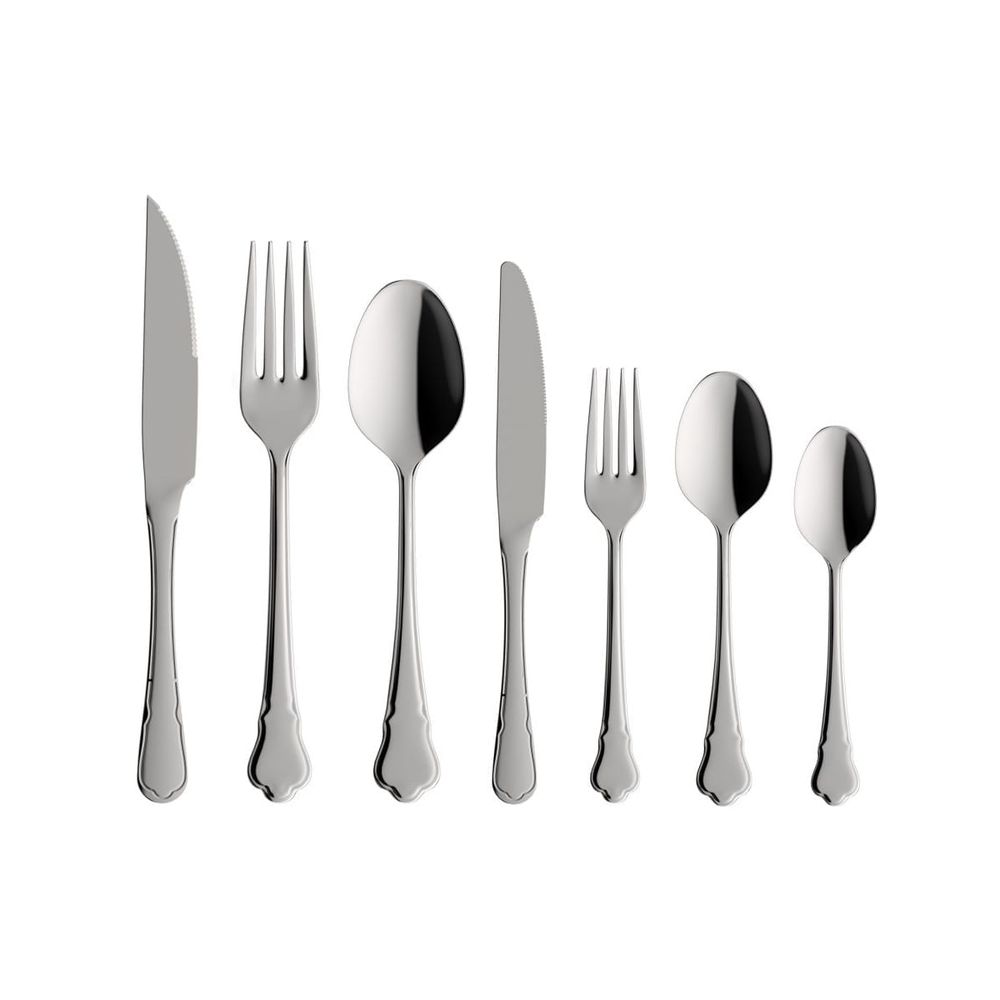 | Conteúdo da embalagem | 6 Facas de churrasco 22,5 cm, 6 garfos de mesa 20 cm, 6 colheres de mesa 19,5 cm, 6 facas de sobremesa 19 cm, 6 garfos de sobremesa 17,5 cm, 6 colheres para sobremesa 17 cm, 6 colheres de chá 14 cm |