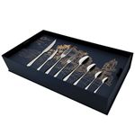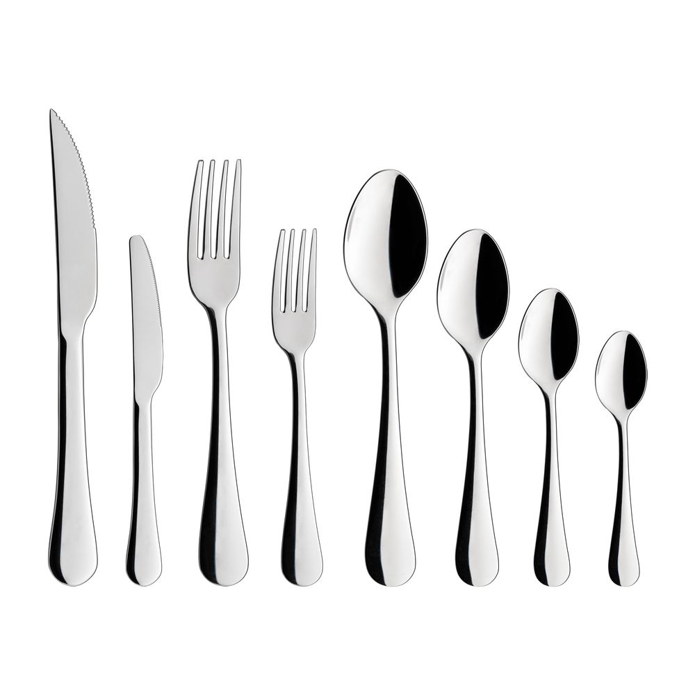 | Conteúdo da embalagem | 12 facas para churrasco 22,5 cm; 12 facas para sobremesa 20 cm; 12 garfos de mesa 20 cm; 12 garfos de sobremesa 17 cm; 12 colheres de mesa 19,5 cm; 12 colheres de sobremesa 17 cm; 12 colheres de chá 14 cm; 12 colheres de café 12,5 cm. |