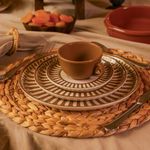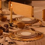O jogo de pratos de sobremesa Flat Atlas apresenta padrões geométricos em amarelo queimado, inspirados nos mosaicos do Marrocos. Sua estampa faz referência às Montanhas do Atlas e à tradição marroquina, o que confere personalidade e identidade cultural únicas a essa cerâmica.