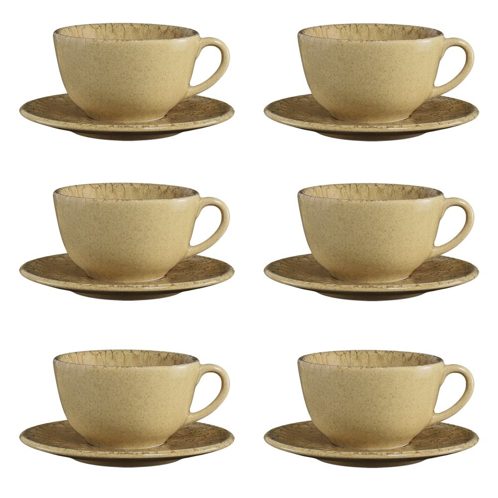 Este jogo de xícaras com pires faz parte da coleção Solara, que explora tons neutros na paleta de dourados e nudes, inspirados nas areias e formações rochosas da Capadócia. O acabamento reagente proporciona um brilho quente e luminoso, resultando em uma estampa envolvente, natural e moderna.